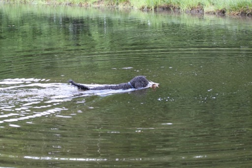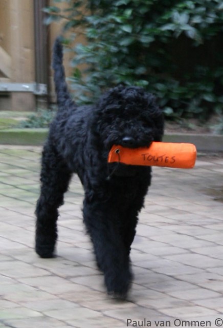 De Barbet is van oorsprong een waterjachthond voor het apporteren van waterwild. Dat apporteren, evenals de liefde voor water, zit de Barbet dan ook in het bloed, zoals onze Toutes hier bewijst op een leeftijd van 5 maanden tijdens de jachttraining. Ze apporteert hier een eend uit het water.